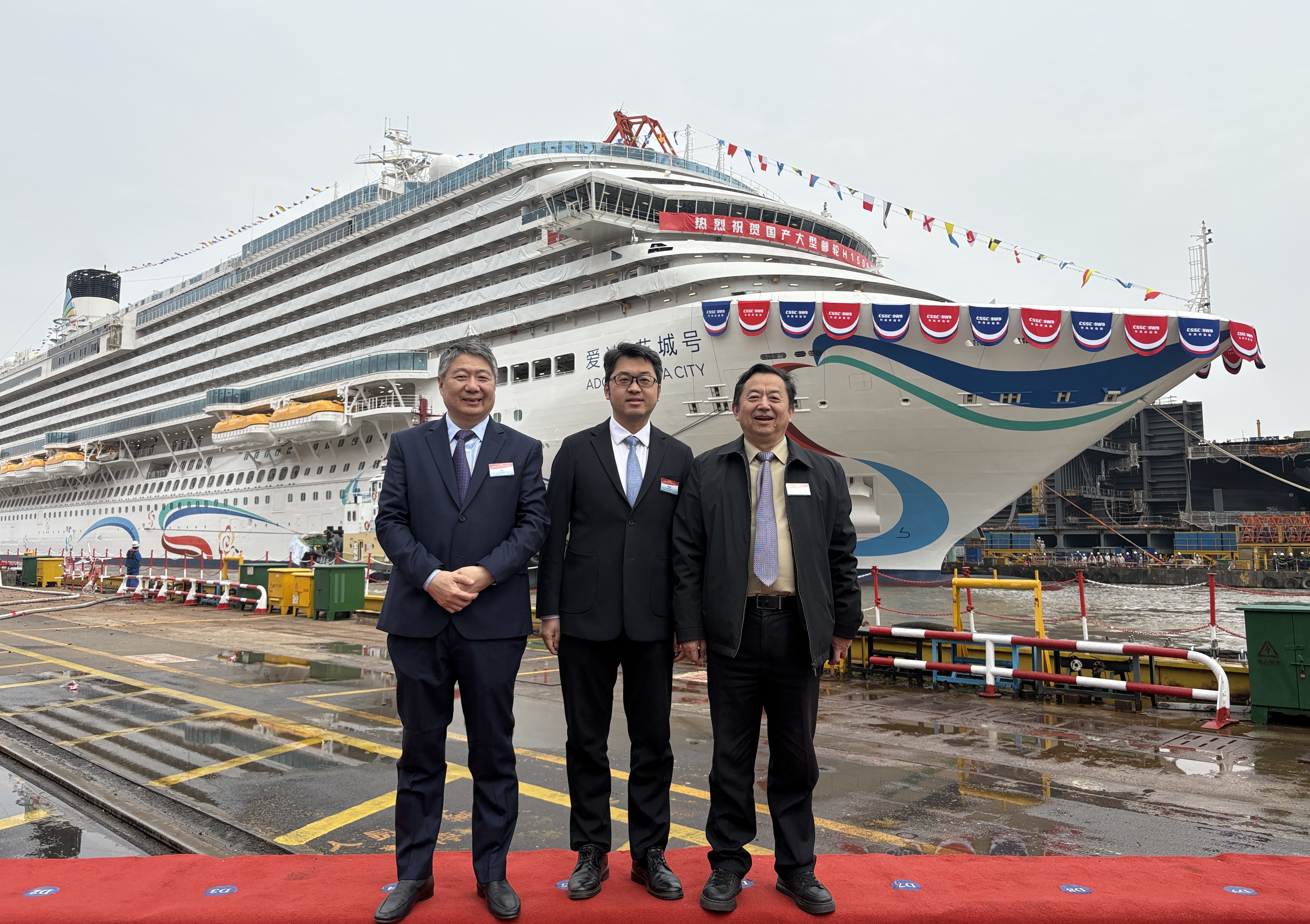 3月20日,国产大型邮轮二号船(H1509,爱达花城号)出坞仪式在上海外高桥造船有限公司举行。作为大型邮轮研发的重要参与单位,我校受邀参加本次仪式,副校长李政颖、船舶与海洋工程学科首席教授吴卫国应邀出席,共同见证中国船舶工业发展进程中这一重要历史时刻。